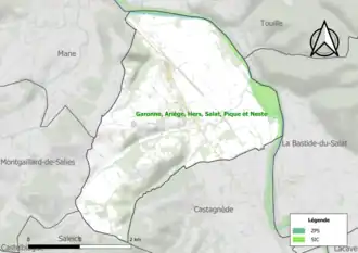 L’inventaire des zones naturelles d'intérêt écologique, faunistique et floristique (ZNIEFF) a pour objectif de réaliser une couverture des zones les plus intéressantes sur le plan écologique, essentiellement dans la perspective d’améliorer la connaissance du patrimoine naturel national et de fournir aux différents décideurs un outil d’aide à la prise en compte de l’environnement dans l’aménagement du territoire. Deux ZNIEFF de type 1[Note 3] sont recensées sur la commune[22] : les « bois entre Saleich et Mane » (882 ha), couvrant 6 communes du département[23] et « le Salat et le Lens » (713 ha), couvrant 32 communes dont 21 dans l'Ariège et 11 dans la Haute-Garonne[24] et une ZNIEFF de type 2[Note 4],[22] : le « massif de l'Arbas » (27 233 ha), couvrant 45 communes dont 24 dans l'Ariège et 21 dans la Haute-Garonne[25].