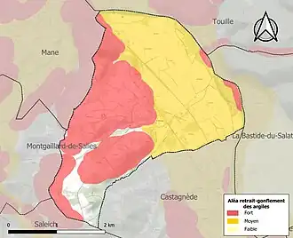 La commune est vulnérable au risque de mouvements de terrains constitué principalement du retrait-gonflement des sols argileux[30]. Cet aléa est susceptible d'engendrer des dommages importants aux bâtiments en cas d’alternance de périodes de sécheresse et de pluie. 91,3 % de la superficie communale est en aléa moyen ou fort (88,8 % au niveau départemental et 48,5 % au niveau national). Sur les 124 bâtiments dénombrés sur la commune en 2019, 123 sont en aléa moyen ou fort, soit 99 %, à comparer aux 98 % au niveau départemental et 54 % au niveau national. Une cartographie de l'exposition du territoire national au retrait gonflement des sols argileux est disponible sur le site du BRGM[31],[Carte 3].