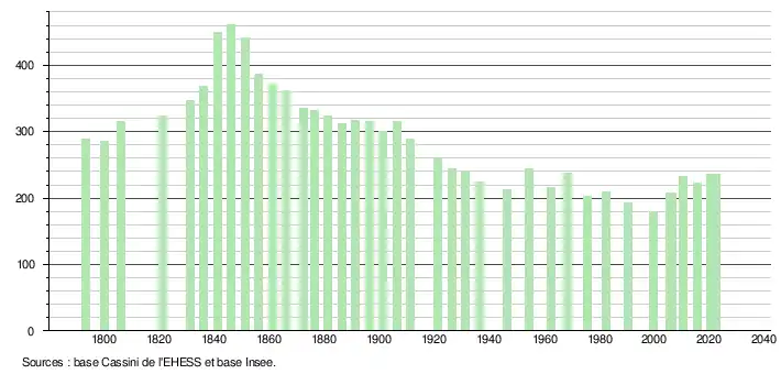 | L'évolution du nombre d'habitants est connue à travers les recensements de la population effectués dans la commune depuis 1793. Pour les communes de moins de 10 000 habitants, une enquête de recensement portant sur toute la population est réalisée tous les cinq ans, les populations de référence des années intermédiaires étant quant à elles estimées par interpolation ou extrapolation[35]. Pour la commune, le premier recensement exhaustif entrant dans le cadre du nouveau dispositif a été réalisé en 2005[36]. En 2022, la commune comptait 236 habitants[Note 6], en évolution de +6,31 % par rapport à 2016 (Haute-Garonne : +8,02 %, France hors Mayotte : +2,11 %). |