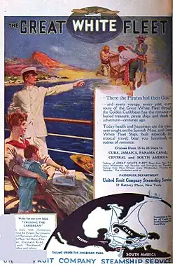 Les États-Unis se trouvaient dans une position avantageuse pour développer le commerce avec l'Amérique latine, car ils entretenaient déjà des liens étroits avec le Mexique, l'Amérique centrale et les Caraïbes. Avec l'ouverture du canal de Panama en 1914 et la perturbation du commerce transatlantique, les exportations américaines vers l'Amérique latine ont augmenté[92]. Le transport dans les Caraïbes devenant moins cher et plus disponible, les importations tropicales fragiles, en particulier les bananes, peuvent atteindre les marchés de masse aux États-Unis. Les navires de la marine américaine jugés excédentaires à la suite de la guerre hispano-américaine (1898) ont été mis à la disposition de la United Fruit Company, qui a créé sa Great White Fleet (grande flotte blanche). Les pays d'Amérique latine dominés par les intérêts américains sont surnommés « républiques bananières ».