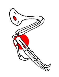 Aile de Confuciusornis. En rouge, l'ouverture de l'humérus et la soudure du Carpométacarpe, Chiappe et al. 1999).Les doigts des ailes aussi s'allongent, occupant progressivement une plus grande proportion du membre antérieur, et le poignet est remodelé. Les théropodes primitifs ont un os du poignet aplati, qui chevauche la base des premier et second os de la paume et les doigts. Chez les maniraptoriens, cet os a une forme de demi-lune le long de la surface de contact avec les os du bras. Cette forme en demi-lune est importante: elle permet à ces animaux de plier le poignet latéralement, et plus seulement verticalement. Ainsi, ils peuvent presque replier leur longue main comme le font les oiseaux actuels avec leurs ailes. Cette main allongée peut aussi être tournée et brusquement projetée vers l'avant pour la capture d'une proie. Seuls les Hoazins et les Touracos ont gardé des griffes sur leurs ailes. Toutefois ils n'en ont que deux (Archaeopteryx en avait trois) et ils les perdent à l'âge adulte. Ils ne peuvent d'ailleurs pas voler à l'âge où ils en sont dotés[9].