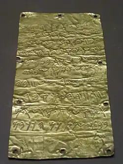 La tradition, qui rapporte un traité entre la puissance étrusque et la cité punique, est appuyée par des indices archéologiques : les lamelles de Pyrgi, trouvées sur le sol italien avec des textes en phénicien et en étrusque[120], sont une dédicace datant d'environ 500 av. J.-C. d'un temple à Astarté, déesse phénicienne, par Thefarie Velianas, roi de Caeré[121]. Les fouilles de Carthage ont également livré une inscription en étrusque destinée à présenter un individu, peut-être un marchand punique. Cette inscription, trouvée sur la colline dite de Sainte-Monique, a peut-être été rédigée dans la cité étrusque de Vulci[122]. Ces éléments s'ajoutent à de nombreuses céramiques à bucchero qui confirment des liens commerciaux précoces, dès le VIIe siècle[122] et au moins jusqu'au début du Ve siècle[121].