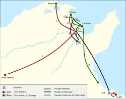 Hamilcar dirige la riposte carthaginoise avec succès : il contrôle pratiquement la Sicile entière en 310 av. J.-C. et fait le siège de Syracuse. En désespoir de cause, Agathocle mène en secret une expédition de 14 000 hommes sur le continent africain afin de sauver son règne par une attaque contre Carthage[140]. Cette expédition est une victoire : Carthage est obligée de rappeler Hamilcar et la majeure partie de son armée pour faire face à la nouvelle menace. L'expédition d'Agathocle connaît une suite de victoires, même si elle est néanmoins incapable de prendre la capitale punique.