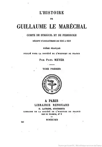 - Paul Meyer, Histoire de Guillaume le Maréchal, comte de Striguil et de Pembroke, régent d'Angleterre, Paris, Société de l'histoire de France, 1891-1901, avec une traduction partielle des sources originales en français moderne. L'ouvrage est également disponible ici.