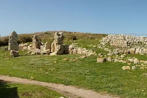 Malte fut peuplée dès environ et une civilisation préhistorique importante a existé sur l'île. Le reste du temple maltais le plus ancien serait un mur de grosses pierres sèches érigé au Néolithique sur le site de Skorba. Datant de , il serait donc antérieur de plusieurs siècles (environ sept siècles) à la première construction mégalithique continentale, le Cairn de Barnenez dans le Finistère (4500 à ), de 1 200 ans aux alignements de Carnac (), de 2 400 ans au cercle de Stonehenge (2800 à ) et 2 600 ans aux pyramides d'Égypte (2600 à ).