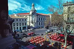 Les grands boulevards entourant « l'Écusson médiéval », nés de la démolition des anciens remparts au XVIIIe siècle, font également l'objet d'importants aménagements dès le début du XIXe siècle renforçant le caractère monumental de la cité : construction du grand théâtre néo-classique à l'italienne avec colonnade et unité urbanistique autour de la Maison Carrée (1798-1822), édification de l'église Saint-Paul de style néo-roman par Charles-Auguste Questel et Flandrin 1835 - (1849) le long de l'actuel boulevard Victor Hugo reliant la Maison Carrée aux arènes ainsi que le lycée Daudet et sa tour de l'horloge, dégagement enfin réalisé de l'amphithéâtre romain et création d'un boulevard de ceinture du monument et d'un vaste parvis, élévation de l'église Sainte-Perpétue (1855-1865) dont le haut clocher domine de ses 70 mètres l'Esplanade, de l'église néo-gothique Saint-Baudile avec ses deux flèches à la jonction des boulevards amiral Courbet et Gambetta (1867-1877), aménagement des squares de la Couronne, de la Bouquerie et du square Antonin en perspective sur le canal de la Fontaine[13], nombreux immeubles bourgeois et hôtels particuliers le long des quais, etc. Les références architecturales à la romanité de la ville sont très nombreuses depuis la Renaissance.