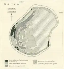 L'extraction du minerai de phosphate, facilitée par la construction d'une ligne de chemin de fer mise en service à partir de 1907[19], peut alors commencer dès 1906[20] : des travailleurs sont amenés des îles Gilbert, de Chine[3] et de la colonie allemande des Carolines pour servir de main-d'œuvre, les Nauruans se montrant peu enclins à travailler dans les mines à ciel ouvert[21],[22]. À la veille de la Première Guerre mondiale, la population de Nauru est composée de 30 Allemands, 70 Britanniques, 1 400 Nauruans et environ 1 000 chinois et Caroliniens[23]. Le commerce du minerai de phosphate devient vite productif : la première année d'exploitation, 11 000 tonnes de minerai de phosphate sont envoyées vers l'Australie[8] et jusqu'en 1913, 138 725 tonnes de minerai de phosphate sont extraites et exportées via 46 navires.
