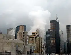 Dès 1902, New York se manifesta après la construction du Flatiron Building par l'architecte Daniel Burnham. Par la suite, avec la multiplication des sièges sociaux d'entreprises et le manque de place à Manhattan, l'architecture du sud de l'île devint de plus en plus verticale : construite en 1909, la Metropolitan Life Tower fait 213 mètres de hauteur et compte 50 étages. Le Woolworth Building, achevé en 1913, mesure 241 mètres pour 57 étages et reste l'immeuble le plus haut du monde jusqu'en 1930. En 1929, New York compte déjà 188 immeubles de plus de 20 étages[62]. Dès les années 1920, un second quartier des affaires se constitue plus au nord, dans le quartier de Midtown.