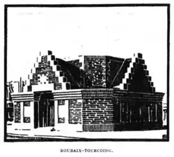 En 1906, a lieu à Tourcoing, l'exposition internationale des industries textiles ; le président de la République Armand Fallières vient la visiter le [34] (élu la même année, il s'agit de sa première visite officielle). Cette exposition, organisée près du canal dans le quartier du Flocon, connut un succès sans précédent pour Tourcoing puisqu'elle accueillit 800 exposants et attira plus de 700 000 visiteurs[35]. Sont alors construits le Palais des industries textiles et des pavillons éphémères élaborés par l'architecte Maxime Sevin qui s'est librement inspiré de ceux bâtis lors de l'Exposition Universelle de Paris de 1900[27]. Le Palais des industries textiles était l'une des plus vastes constructions de l'exposition : il comportait un grand hall dédié aux produits textiles et au fonctionnement des métiers, mais également une salle d'honneur aux décorations de stuc doré rappelant Versailles ainsi qu'une salle d'exposition d'objets d'art et de produits manufacturés décoratifs. La façade de ce Palais était exubérante, une architecture fastueuse évoquant le style Louis XVI[36].