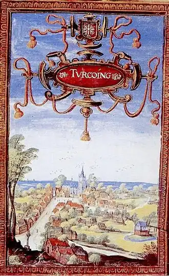 - ↑ Trois incendies en moins de cinquante ans réduisirent la Grand'Place en cendres, ainsi que les rues avoisinantes : ce qui explique l'absence de patrimoine antérieur au XVIIe siècle à Tourcoing, hormis l'église Saint-Christophe (dont le clocher remonte aux XIIIe siècle et XVIe siècle et l'hospice d'Havré (construit en 1630). Le château du Bailly survécut à ces incendies mais fut rasé en 1877.