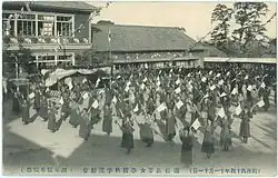 Dès le début de la guerre contre la Chine en 1937, le système éducatif est assez largement mis à contribution dans le cadre de l'effort de guerre. Dans l'enseignement supérieur, l'accent est mis sur la formation d'ingénieurs et de médecins au travers de la création de nombreux instituts de recherche[24]. Entre 1935 et 1945, le nombre d'étudiants dans les facultés de sciences passe de neuf mille à trente mille, et dans les facultés d'ingénierie, de 14 837 à 85 680[n 2],[25]. Un entraînement militaire obligatoire est aussi institué, dès 1924 dans l'enseignement secondaire, puis en 1939, dans les universités. Les étudiants sont assez largement épargnés par la conscription, mais la situation change à partir du déclenchement de la guerre contre la Chine en 1937, et l'âge est peu à peu abaissé pour intégrer la plupart d'entre eux[26]. C'est ainsi qu'en 1943, cent trente mille étudiants sont mobilisés par l'armée[27]. Les élèves du secondaire et les étudiants servent aussi de réserve de main-d'œuvre pour les secteurs prioritaires. En 1939 est instauré un service de travail des élèves, ou gakuto dōin[28]. Au , environ 3,5 millions d'élèves et d'étudiants travaillent par ce biais dans des fermes, des usines, ou des hôpitaux pour pallier le manque de main-d'œuvre[29].