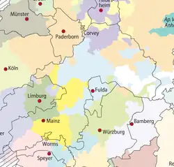 Cependant, cette primauté de Mayence ainsi établie n'a jamais signifié autre chose que le précédent du droit coutumier, c'est-à-dire la priorité honorifique sur les autres évêques. Le développement d'une primauté au sens juridique, en tant qu'autorité hiérarchique entre le pape et le métropolite, n'a jamais eu lieu en Occident[37]. En outre, l'archevêque de Trèves revendiquait également les droits de primat, et depuis 968, l'archevêque de Magdebourg le faisait également.
