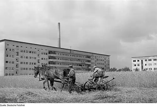 Dans la zone d’occupation soviétique, la reconstruction se fait beaucoup plus lentement que dans les zones d’occupation occidentales. L’Union soviétique s’octroie des réparations sous la forme de machines-outils et d’infrastructures comme les locomotives et les rails de chemins de fer. L’Allemagne verse 20 milliards de dollars à l’URSS à titre de réparation[10]. C’est pour cela que la situation jusqu’en 1948 ne s’améliore pas. Puis l’URSS reconstruit la RDA sur le modèle économique soviétique. Dès la fin de la guerre, le gouvernement soviétique met fin à l’économie de marché et au libéralisme. La première réforme industrielle de 1945 supprime le patronat. Les grandes industries privées sont saisies par le gouvernement et transformées en entreprises d’État ou sociétés anonymes publiques. Seuls l’artisanat et les métiers de la gastronomie comptent encore des entreprises privées. Dans les années 1950, l’État oblige les petites entreprises agricoles à s’associer en coopérative. La collectivisation et la planification des productions mettent fin à l’existence des petites entreprises privées. La reconstruction économique est donc très compliquée à l’Est, car le plan économique s’avère peu efficace et la population mécontente peine à survivre.
