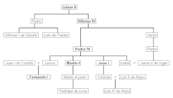 La Couronne d'Aragon connait une grave crise de succession à la mort du roi Martin Ier « l'Humain », le 31 mai 1410, sans descendance légitime. Le seul enfant arrivé à l'âge adulte, Martin le Jeune, est mort en ne laissant qu'un fils illégitime, Frédéric (ou Fadrique de Luna). L'héritier mâle le plus proche est le comte Jacques II d'Urgell qui n'a que peu de soutien parmi les noblesses locales, mais le duc d'Anjou, Louis II est un autre candidat possible. Une guerre de succession se déclenche en 1410 entre les partisans de Jacques II, ceux de Louis et ceux de Jean II de Castille. Finalement, la question dynastique est définitivement réglée par une conférence tenue en Aragon, connue comme le compromis de Caspe, sous l'autorité du pape d’Avignon Benoît XIII. Celui-ci, désireux de se constituer une clientèle politique, décide les conférenciers à choisir un noble d'origine castillane, de la maison de Trastamare, Ferdinand de Antequera, fils de Jean Ier de Castille et d'Éléonore d'Aragon. Ce choix déclenche la révolte de Jacques d’Urgell, qui est vaincu, tandis que Ferdinand devient roi sous le nom de Ferdinand Ier.