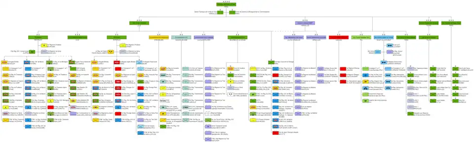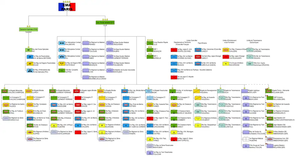 Le commandement des forces terrestres (CFT, ex-CFAT) a autorité sur trois états-majors de forces, sept brigades interarmes et six brigades spécialisées et directement sur des unités :