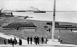 Le Congrès autorise officiellement la création de l’Académie militaire des États-Unis en 1802, mais il faut près de 50 ans pour approuver une école semblable pour la marine[60]. Au cours de la longue période de paix entre 1815 et 1846, les aspirants disposent de peu de possibilités de promotion, et leurs fonctions sont souvent obtenues par favoritisme et clientélisme. La mauvaise qualité de la formation des officiers de la Marine des États-Unis devient publique après l’affaire Somers, une prétendue mutinerie à bord du navire de formation USS Somers en 1842. Le , le capitaine du navire fait exécuter l'aspirant Philip Spencer (en), fils du Secrétaire à la Guerre des États-Unis, John C. Spencer, sous l’accusation de pseudo conspiration[61]. George Bancroft, nommé secrétaire à la marine en 1845, décide alors de passer outre l'approbation du Congrès et crée une nouvelle académie pour les officiers de la marine. Il forme un conseil dirigé par le commodore Matthew Perry pour installer un nouveau système de formation, et transforme le vieux Fort Severn à Annapolis pour accueillir la nouvelle institution en 1845. L’école est finalement approuvée par le Congrès en 1851 et baptisée Académie navale d'Annapolis[60].