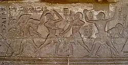 La plus ancienne description d'une compétition d'escrime est un bas-relief du temple de Médinet Habou, près de Louxor en Égypte, construit par Ramsès III en 1190 av. J.-C. Les armes sont mouchetées, un bouclier attaché au bras gauche sert à parer, les escrimeurs sont protégés par un masque, une mentonnière et une protection pour les oreilles. Le vainqueur salue de son arme et de la main le pharaon qu’accompagne sa suite. Un scribe note sur un papyrus les résultats de la compétition[2],[3].