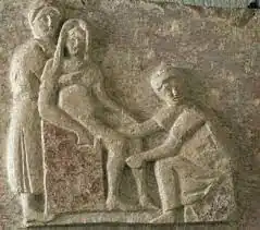 Il existe des sages-femmes (obstetrix) et des médecins gynécologues-accoucheuses (medica ou iatromea)[3]. Ce sont deux fonctions très valorisées. Les premières sont chargées des cas simples, ne semblant pas devoir présenter de complications. Un médecin est appelé à l'aide en cas de problème. L'un d'eux eux, nommé Soranos, est réputé pour maîtriser deux pratiques : la version podalique, qui consiste à modifier la position d'un enfant qui se présente mal pour qu'il se présente par les pieds, et l'avortement tardif, si l'enfant n'arrive pas à sortir. Le fœtus est alors sacrifié pour sauver la vie de la mère : un cranioclaste peut être alors utilisé pour pratiquer une cranioclasie (écrasement du crâne), et un embryotome sert à découper le corps du fœtus in utero ; les morceaux sont enlevés au fur et à mesure avec un crochet. Cette technique essaime à travers l'Europe, et un cadavre de fœtus traité de la sorte aurait été retrouvé en Angleterre au IVe siècle. Le matériel d'accouchement se compose de deux lits, l'un réservé à la phase de travail, le second à la phase de repos après l'accouchement, tandis que l'expulsion se fait sur une sorte de chaise percée à dossier droit et munie de poignées. La sage-femme assiste à l'expulsion par le trou de la chaise. Les forceps sont alors inconnus, et l'accouchement redouté en raison du risque de mortalité élevé[4].