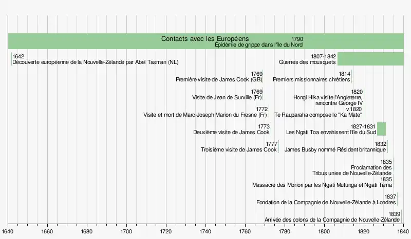 De 1788 à 1840, les îles de Nouvelle-Zélande font officiellement partie de la Nouvelle-Galles du Sud (Australie). Se rendant compte du caractère désordonné de la colonisation européenne en Nouvelle-Zélande et de l'intérêt croissant de la France pour ce territoire (autour d'Akaroa), le gouvernement britannique envoie William Hobson proclamer la souveraineté britannique et négocier un traité avec les Māori. Le traité de Waitangi est signé dans la baie des Îles le [34]. Ce traité est écrit rapidement et dans la confusion ; on se dispute encore sur la traduction du document en maori. Le traité est vu comme l'acte fondateur de la Nouvelle-Zélande en tant que nation et comme la charte garantissant les droits des Maoris.