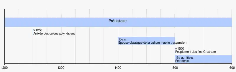 Les premiers colons sont des Polynésiens de l'est (îles de la Société, îles Cook, les îles Australes de Polynésie française[1]) qui arrivent probablement entre 1050 et 1350 apr. J.-C., naviguant dans des waka avec l'aide des systèmes météorologiques subtropicaux[2] ou des oiseaux migrateurs ou des baleines[3],[4], et établissent la culture indigène maorie[5]. Aux alentours de l'an 1500, certains Maoris partent s'installer sur les îles Chatham[2],[6],[7],[8],[9],[10], y développant leur propre culture moriori[11],[12].