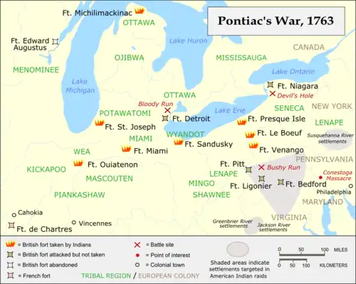 Après leur victoire contre les Français lors de la guerre de Sept Ans, les Britanniques prennent possession de la ligne de fortifications construite par Paul Marin de la Malgue à l'extrémité occidentale de la Pennsylvanie, comprenant le fort de la Presqu'île, le Fort Le Boeuf, le fort Machault et le fort Duquesne[7]. Plusieurs furent détruits par les Amérindiens lors de la rébellion de Pontiac. Avant même la Guerre de sept ans, ces terres étaient convoitées, non pas par la Pennsylvanie, mais par le gouverneur de la Virginie, Robert Dinwiddie et le marchand John Hanbury III, allié aux frères de George Washington dans l'Ohio Company. Dans ce but, le , trois ans avant le début de la guerre, Robert Dinwiddie charge George Washington de rencontrer les Français au Fort Le Boeuf, au prétexte d'une lettre au gouverneur de la Nouvelle-France[8]. Les tribus de la vallée de l'Ohio, Delawares, Shawnees et Mingos, y avaient émigré au début du XVIIe siècle pour échapper à la domination des Britanniques, des Français et des Iroquois[9], sans affinités particulières avec les Français[10]. Rassurés par la Proclamation royale de 1763, interdisant la colonisation à l’ouest des Appalaches, les Indiens signèrent une paix séparée avec les Britanniques à la condition que leurs troupes quittent la vallée. Ceux-ci renforcèrent au contraire les forts de la Frontière sauvage, ce qui conduisit les tribus de l'Ohio à repartir en guerre en 1763[11], dans le cadre la rébellion de Pontiac. La terreur qui en résulta convainquit les Pennsylvaniens de l'Ouest que leur gouvernement les protégeait très mal, d'où un soulèvement mené par un groupe d'auto-défense du village de Paxton, en Pennsylvanie, appelé les Paxton Boys. Ceux-ci s'attaquèrent aux Amérindiens dont la plupart vivaient paisiblement, convertis au christianisme, dans de petites enclaves au milieu des implantations européennes.