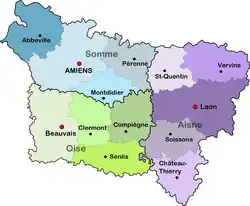 - En second lieu, une des ex vingt-deux régions administratives de la France métropolitaine réunissant les trois départements de la Somme, de l'Oise et de l'Aisne de 1964 au et dont la capitale régionale fut Amiens.