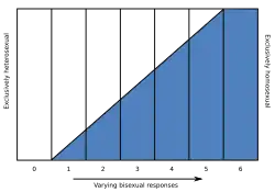 Kinsey rejette la notion d'une ligne de démarcation claire entre les différentes sexualités. Au lieu d'affecter les personnes à différentes catégories de sexualités, Kinsey et ses collègues développent une échelle de Kinsey à sept niveaux[35] — stop —. Selon le Kinsey Institute, les livres publiés par Kinsey se sont vendus à près d'un million d'exemplaires dans le monde et ont contribué à révolutionner la perception de la sexualité dans l'opinion publique[36].