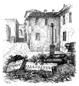« Ici, où s'étend cette place s'élevait autrefois la boutique du barbier Giangiacomo Mora, qui, ayant conspiré avec Guglielmo Piazza, commissaire de la Santé publique, et avec d'autres, pendant qu'une peste affreuse exerçait ses ravages, par des onguents mortels répandus de tous côtés, précipita beaucoup de citoyens vers une mort cruelle. C'est pourquoi le Sénat, les ayant tous deux déclarés ennemis de la patrie, ordonna que, placés sur un char élevé, ils seraient tenaillés avec un fer rouge, leur main droite tranchée, leurs os rompus ; qu'ils seraient étendus sur la roue, et, après six heures, mis à mort, brûlés ; ensuite, et pour qu'il ne restât aucune trace de ces hommes criminels, que leurs biens seraient vendus à l'encan, leurs cendres jetées dans le fleuve ; et, afin d'éterniser la mémoire de ce fait, le Sénat voulut que cette maison, où le crime avait été préparé, fût rasée, sans jamais pouvoir être réédifiée, et à sa place fût élevée une colonne qu'on appellerait infâme. Arrière donc, arrière, bons citoyens, de peur que ce sol maudit ne vous souille de son infamie. »[2]