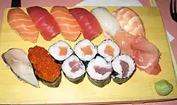 - (en) Cet article est partiellement ou en totalité issu de l’article de Wikipédia en anglais intitulé « History of sushi » (voir la liste des auteurs).