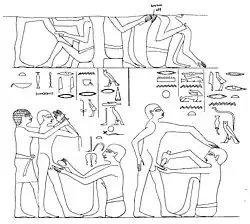 Scène de circoncision de jeunes gens sur le montant de la porte d'une tombe à Saqqara, datée du règne du pharaon Téti (vers 2500 av. J.-C.).