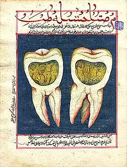 Dans le livre paru au milieu du Xe siècle, Liber Regius, le médecin arabe Ali Abbas (ʿAli ibn al-ʿAbbās, † 944) recommande aussi l'utilisation d'arsenic pour la dévitalisation (nécrose) de la pulpe[51]. L'oxyde d'arsenic trivalent est utilisé jusqu'à récemment pour la dévitalisation de la pulpe dentaire et ne disparait que dans les années 1970 en raison de son action cancérogène, des inflammations du parodonte, de la perte d'une ou plusieurs dents, de la nécrose de l'os alvéolaire voisin ainsi que des allergies et des symptômes d'empoisonnement[52]. Quelques indications sur les soins à apporter aux dents et à leurs maux se trouvent dans les œuvres du grand savant juif médiéval Maimonide (1135/38−1202). Il ne peut s'appuyer que sur quelques passages du Talmud. Un d'entre eux interdit à un prêtre (cohen) le service divin quand il lui manque des dents, parce qu'un tel cohen est méprisable[53].