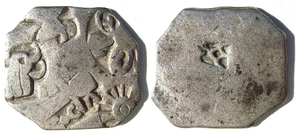 Pièce en argent de l'Empire Maurya, portant les symboles de la roue et de l'éléphant. IIIesiècleav. J.-C.
