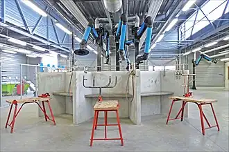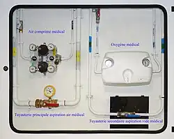 - Les hôpitaux avec les eaux froides brutes, les eaux traitées pour satisfaire la technique des appareils de soins toujours plus spécialisés, les réseaux d'eaux chaudes aux températures plus ou moins importantes, pour les besoins des chambres, cuisines et buanderies. Ce sont aussi les évacuations de ces eaux plus ou moins chargées de produits et matières polluantes diverses, qui doivent être traitées dans des stations ou des bacs de traitement, avant leur rejet dans les réseaux des égouts ou autres déversoirs[4].