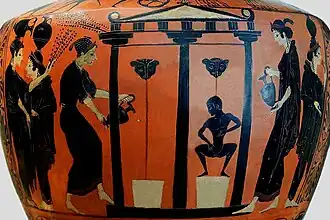 La Grèce antique avait pour l'eau un véritable culte. Les protectrices des eaux et des sources étaient les nymphes. Les anciennes fontaines sont célèbres comme la fontaine de Castalie à Delphes, la Fontaine aux neuf bouches (la Fontaine Ennéacrounos) de l'Agora d'Athènes.... Ils (les Pelasges) s'en prirent aux jeunes filles qui allaient chercher de l'eau à la fontaine Ennéacrounos...[78].