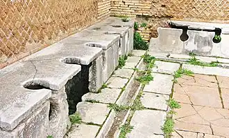 Babylone, est une ville antique de la Mésopotamie située dans l'Irak actuel. On situe le début de sa construction au IIIe millénaire, mais sa profonde transformation et son apogée datent du Ve siècle av. J.-C., avec le roi conquérant Nabuchodonosor II et la construction de palais, temples, ziggourats et des grandes voies de circulation. Babylone, ville plusieurs fois détruite et reconstruite au cours des âges, est l'objet de fouilles depuis une centaine d'années par plusieurs équipes internationales dont des allemandes[48]. La ville était construite sur la partie gauche de l'ancien lit de l'Euphrate, des fossés et canaux remplis par l'eau du fleuve constituaient à la fois un rideau défensif, mais également permettaient le drainage des eaux de pluie et l'évacuation des eaux usées vers le fleuve[49]. Des réseaux d'adduction d'eau de la ville il subsiste peu d'informations, soit par la destruction du site au cours des différentes invasions, anciennes ou plus récentes, soit également par les recherches archéologiques non terminées ou pas encore entreprises.