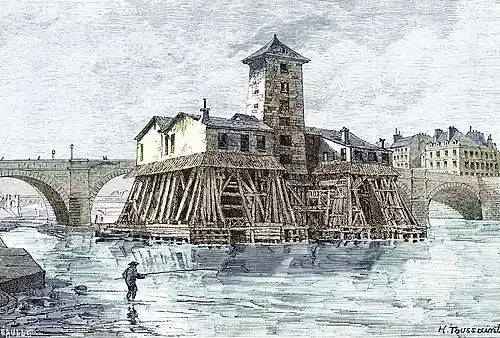 - ↑ Pierre Louis Viollet, « L'Hydraulique dans les civilisations anciennes », « Histoire de l'énergie hydraulique, moulin, pompes, etc ». Fulgence Girard, « La pompe du pont Notre-Dame », Le Monde illustré, no 10, p. 11, du 20 juin 1857. L'Histoire en Ligne. « Les ponts de Paris, le Pont Notre Dame ».