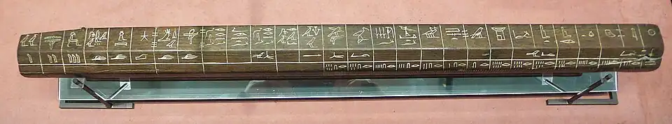 « Suivant le morceau de tube de 0,85 m de long trouvé...la jonction latérale était placée en dessus, ce qui permettait une étanchéité jusqu'au remplissage maximum du tube. La pente de la canalisation était faible mais régulière, environ 1,5 %, qui correspond approximativement à une pente de 1 pouce pour une aune égyptienne... » [20]. Par rapport au système métrique, 1 doigt = 1,89 cm et 1 aune égyptienne = 5 m environ[21]. »