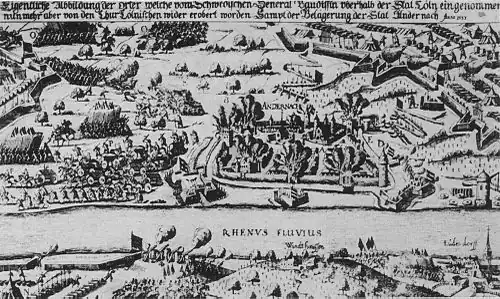 Par la suite toutefois, lors de la guerre de Cologne (1583–1588), la ville d'Andernach a été attaquée par les troupes du Pays-Bas, sous le commandement du chef brabançon, Olivier van den Tympel. Ce dernier était venu en pays rhénan pour le compte de Gerhard Truchses, afin de combattre son successeur Ernest de Bavière, et de recruter des soldats dans la partie sud du territoire de l'électorat. L'assaut a eu lieu à la porte des graines (coté Rhin) qui a été alors partiellement détruite par une explosion, mais l'opération a finalement été déjoué grâce à la résistance des citoyens d'Andernach.