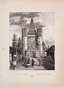 En 1398, la porte de la ville « Spalentor » est construite lors d'une extension des murs, qui avaient été partiellement détruite par le tremblement de terre. Les pierres tombales du cimetière de la première communauté juive sont mélangées avec d'autres pierres et débris pour la construction du mur. Plusieurs spécialistes de l'histoire ancienne mentionnent ces pierres tombales, notamment Johannes Tonjola. Dans son introduction à Basilea Sepulta, 1661, il décrit comment il avait compté 570 pierres tombales hébraïques en se promenant le long du mur de la ville.