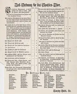 Une autre mesure anti-juive est le péage des dés. Les Juifs qui voyagent en Suisse, en Allemagne et au Liechtenstein doivent souvent payer avec des dés en plus de l'argent des douanes. Symboliquement, cela fait référence aux soldats qui jouaient aux dés pour les vêtements de Jésus au pied de la croix. La pratique du péage aux dés n'est pas seulement humiliante mais aussi très gênante, car les dés ne sont pas seulement réclamés aux postes de douane, mais aussi par des passants hostiles[7]. En Suisse, le péage aux dés a été largement remplacé par des règlements financiers au cours du XVIIe siècle. Après la Révolution française, la France (entre autres) met de la pression sur Bâle pour qu'elle mette fin aux mesures discriminatoires, et en 1794, le péage aux dés est aboli[8].