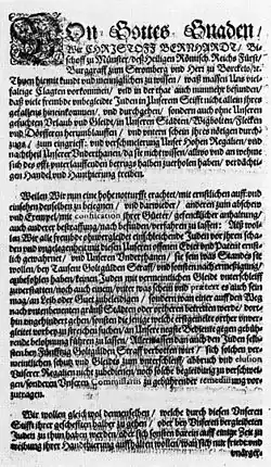 En 1560, l'Assemblée des États décide d'expulser tous les juifs de l'évêché de Münster. En raison d'intérêts divergents entre les États, cet édit n'est pas appliqué. Dans le Münsterland, de nombreuses communautés juives continuent donc à se développer. Bien que le Reichstag de 1551 stipule que les Juifs peuvent participer aux marchés, un détaillant juif de Hamm est arrêté en 1603 pour avoir essayé de s'installer au marché de Münster. Les médecins juifs sont eux traités avec plus d'égard, par exemple, le médecin Hertz de Warendorf reste plus de six mois à Münster au début du XVIIe siècle pour soigner les fonctionnaires épiscopaux. En raison du nombre croissant de Juifs cherchant à entrer, l'administration de la ville de Münster introduit en 1616 un Passierscheinwesen (Certificat de passage), qui sera modifié en 1620 puis en 1621. Le secrétaire municipal est obligé de saisir les noms et la durée du séjour et de collecter les frais de passage. Les revenus du soi-disant Judengeleit (sauf-conduit des Juifs) ne vont contribuer que très faiblement aux finances de la ville.