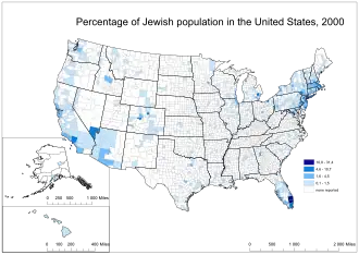 Au point de vue géographique, New York reste le centre de la vie juive américaine, même si son importance relative a décru de 56% dans les années 1930 à 38% dans les années 1990, au profit de Los Angeles, Miami, Chicago,etc.[61].