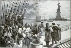 Dès les années 1870, les immigrants d'Europe orientale[29] arrivent aux États-Unis comme le montre la parution des premières publications en yiddish. Mais c'est à partir de l'assassinat du tsar Alexandre II en 1881 et des vagues de pogroms qui l'ont suivi que l'immigration devient massive. Elle est renforcée par l'expulsion des Juifs de Moscou en 1890, par les pogroms de Kichinev en 1903 et par ceux qui suivent la défaite russe dans la guerre russo-japonaise et la révolution avortée de 1905. Cette immigration amène deux millions de Juifs en Amérique et n'est ralentie qu'avec l'Immigration Act de 1924[30].