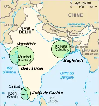 L'histoire des Juifs en Inde recouvre celle de trois communautés juives historiques totalisant six mille membres (1997), chacune dans une aire géographique très déterminée : la communauté de Cochin dans le Sud du sous-continent, les Bene Israël dans les environs de Bombay et la communauté Juifs Baghdadi ceux de Bagdad ») aux alentours de Calcutta et de Bombay. La communauté de Cochin est elle-même divisée en deux groupes : les « Juifs noirs », plus anciens, et les « Juifs blancs », d'origine plus récente.