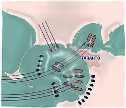 Tarente, important port de la Grande-Grèce, dont la fondation dans cette zone date traditionnellement de 706 av. J.-C. à la suite du déplacement de plusieurs colonies spartiates par nécessité d'expansion ou pour des questions commerciales[2]. Taras a eu d'importantes visées expansionnistes, et la rivalité a été durable entre les populations de Tarente et les Messapes, une rivalité narrée par Hérodote lorsqu'il raconte l'extermination des armées de Tarente et Reggio de Calabre en 473 av. J.-C. à la suite de l'alliance entre Messapes et Lucaniens. Au Ve siècle Taras s'aligne sur la politique de Sparte et elle vit une période florissante pendant la gouvernance de Archytas, qui signe l'apogée du développement et la reconnaissance d'une supériorité politique sur les autres colonies de l'Italie méridionale. C'est de cette époque que date l'occupation de l'île qui donne naissance à la future Gallipoli : les Tarentins en ont fait une escale commerciale. De 343 à 338 av. J.-C. les Tarentins combattirent les Messapes, combats marqués par la mort du roi sparte Archidamos III accouru les aider.