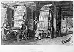 Fabrique d'indiennes de Mrs. Gros Davillier Roman & Cie à Wesserling (du côté du couchant): lithographie de Godefroy Engelmann, de la série Manufactures du Haut-Rhin, réalisée entre 1822 et 1825.