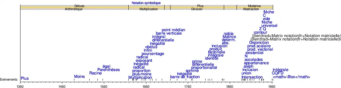 Le développement des notations mathématiques peut être divisé en étapes[4],[5]. L'étape rhétorique correspond à l'époque où les calculs sont réalisés par des mots, sans symboles[6]. L'étape syncopée en vient à utiliser des abréviations syntaxiques pour les opérations et quantités fréquemment utilisées. De l'Antiquité jusqu'à l'ère post-classique[note 1] des éclats de créativité mathématique ont souvent été suivis par des siècles de stagnation. Au début de l'époque moderne et que l'accès à la connaissance s'est facilité, des exemples écrits de développements mathématiques sont apparus. L'étape symbolique est atteinte quand des systèmes compréhensibles de notation l'emportent sur la rhétorique. Commençant en Italie au XVIe siècle, de nouveaux développements mathématiques, en interaction avec de nouvelles découvertes scientifiques, sont faits à vitesse croissante qui continue encore de nos jours. Cette étape symbolique était déjà d'actualité chez les mathématiciens indiens médiévaux et en Europe depuis le milieu du XVIIe siècle[7] et a continué de se développer à l'époque contemporaine.