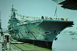 - ↑ Pour 250 mètres de longueur et 32 mètres de largeur plus lourd que les porte-avions des autres marines alors en service