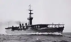 Enfin, le premier porte-avions britannique construit en tant que tel, le HMS Hermes de 11 000 tonnes environ, lancé en , était encore en travaux au moment de la conférence de Washington[11]. Ces deux bâtiments avaient une caractéristique nouvelle, un îlot à tribord incorporant la passerelle et les conduits de fumée des chaudières.