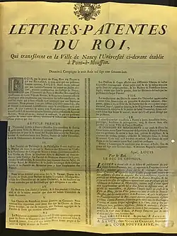- ↑ Site des Archives 54 : « Nancy reçoit une faculté qui dispense trois enseignements : les belles lettres, la philosophie et l’histoire. Metz, de son côté, obtient une faculté des sciences. ». Consultable en ligne.